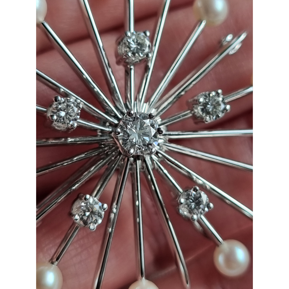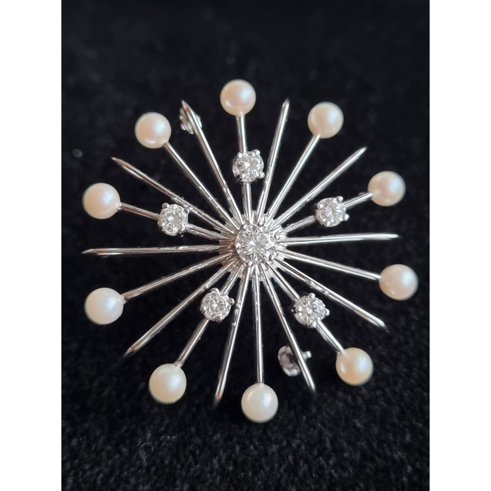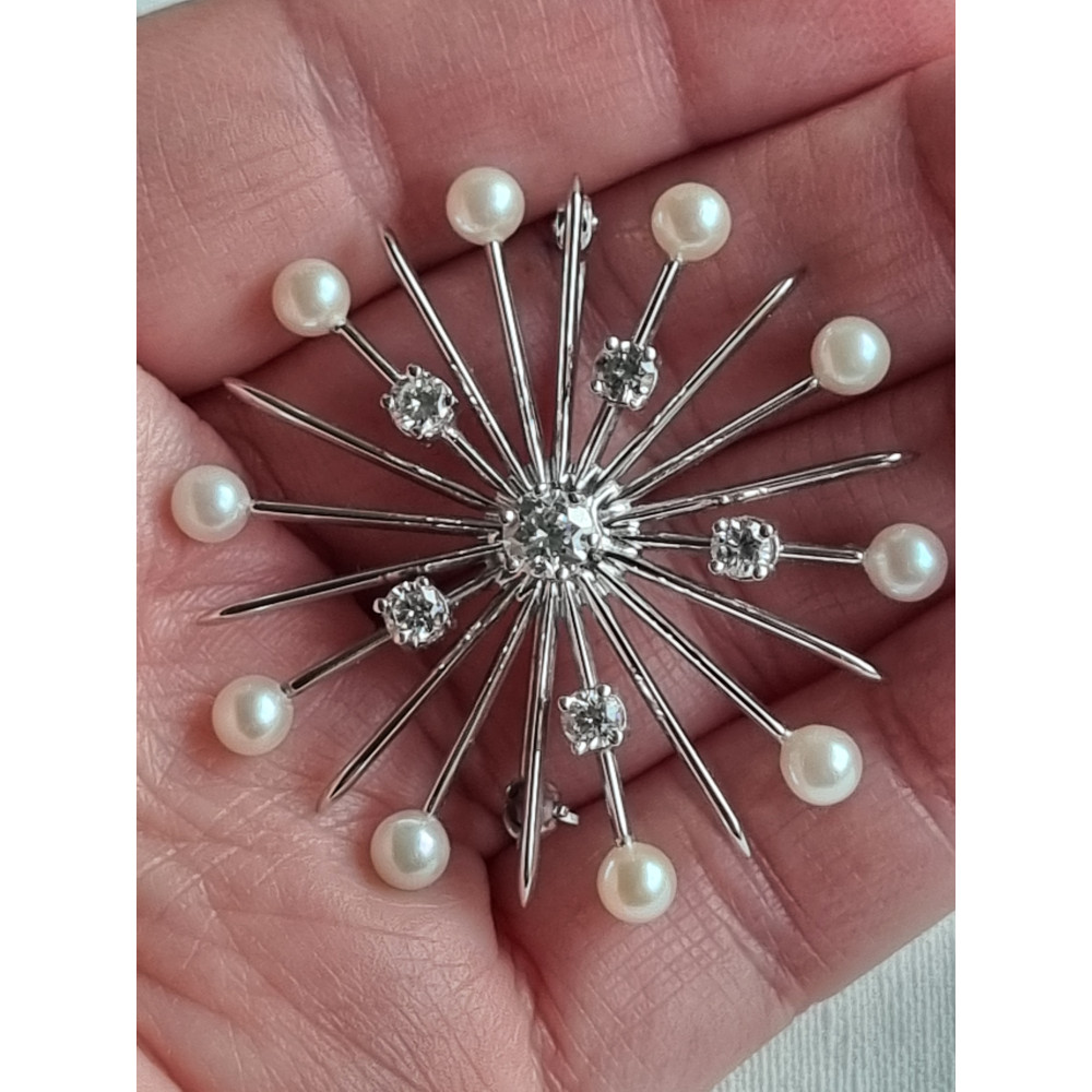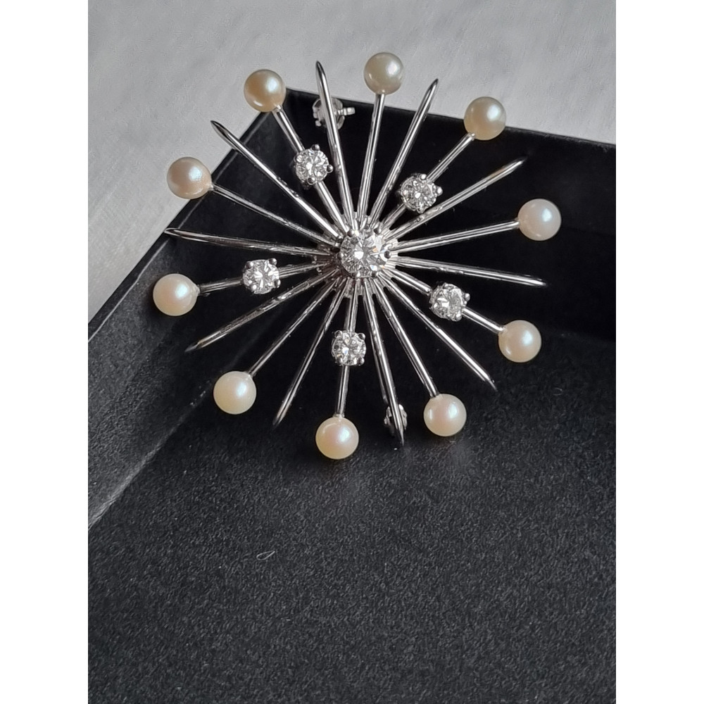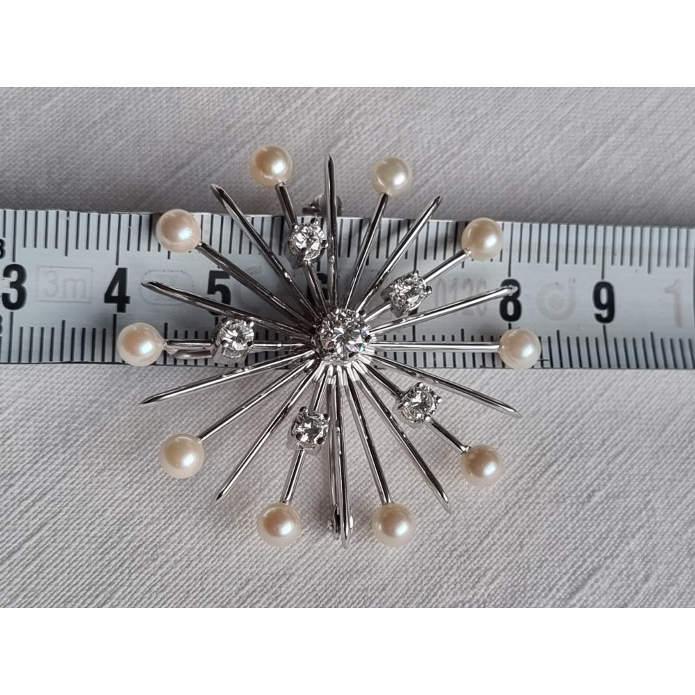 Et utsøkt eksemplar av Sonja nålen, ofte kun med perler. Denne med både diamanter og perler. Meget pene steiner. Godt stemplet på baksiden for 585, 14 karat hvitt gull og med mesterstempel fra Sigurd Homstvedt.