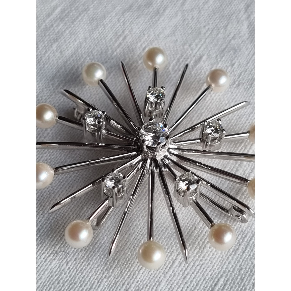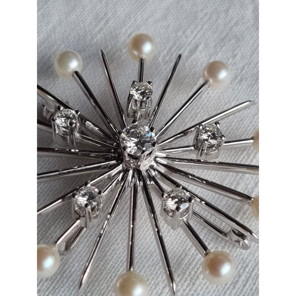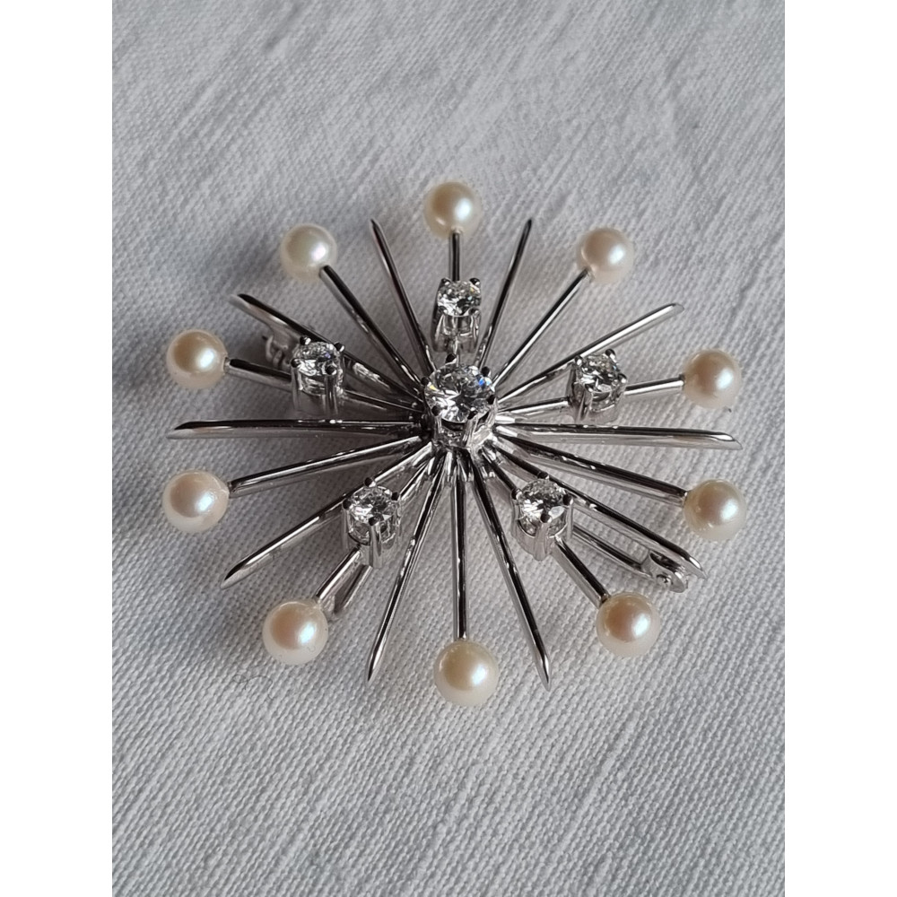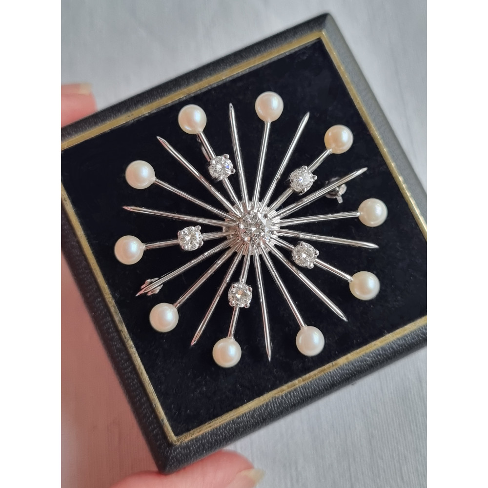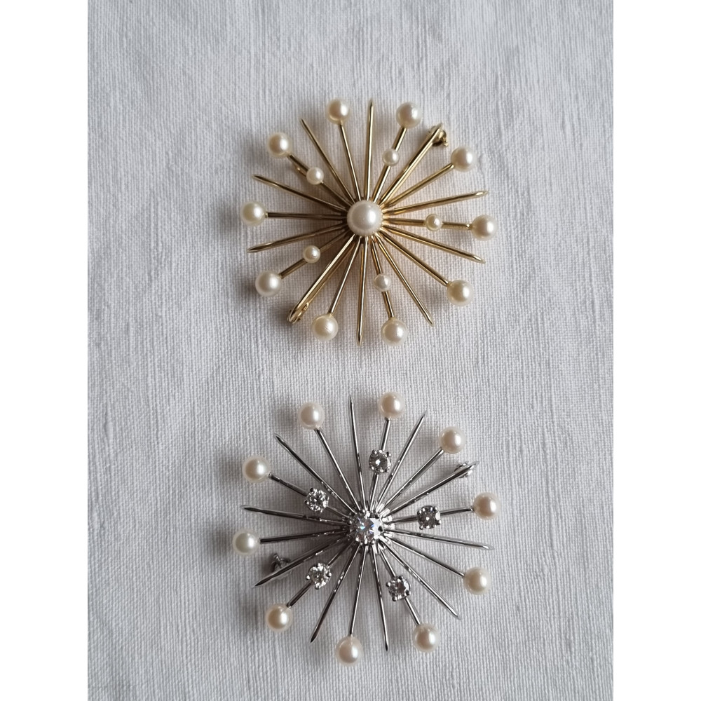 Et utsøkt eksemplar av Sonja nålen, ofte kun med perler. Denne med både diamanter og perler. Meget pene steiner. Godt stemplet på baksiden for 585, 14 karat hvitt gull og med mesterstempel fra Sigurd Homstvedt.