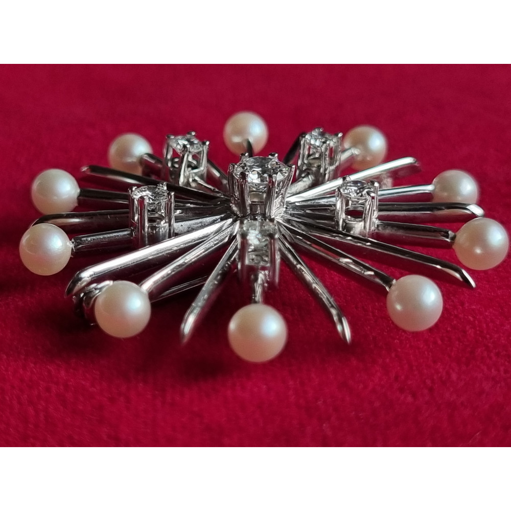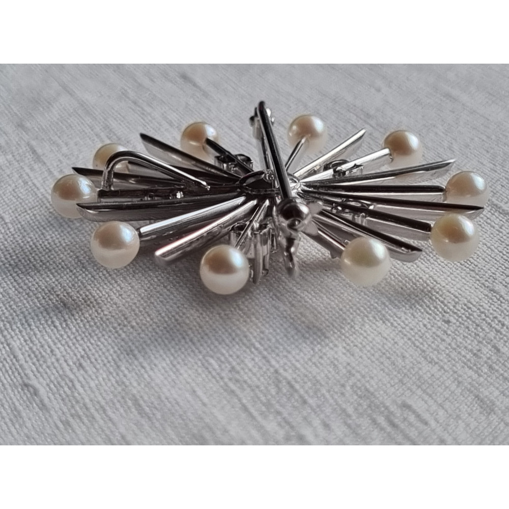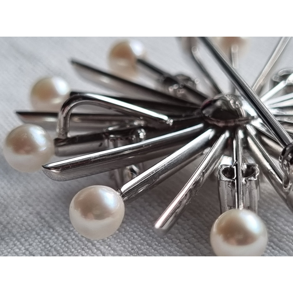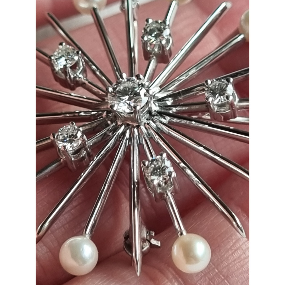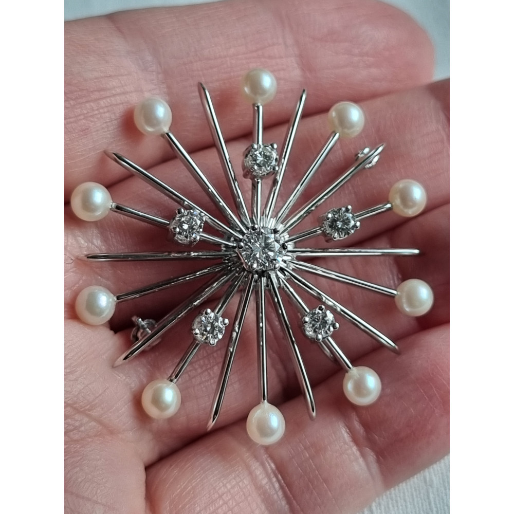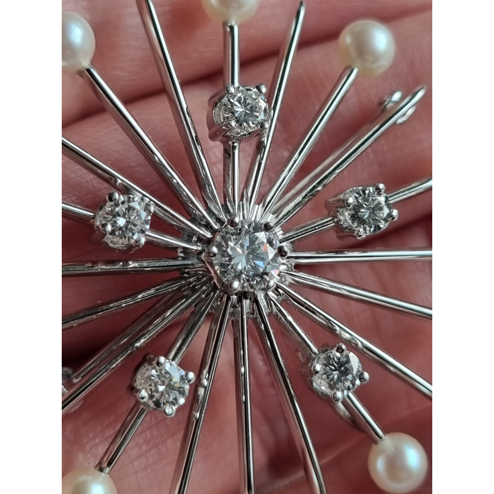 Et utsøkt eksemplar av Sonja nålen, ofte kun med perler. Denne med både diamanter og perler. Meget pene steiner. Godt stemplet på baksiden for 585, 14 karat hvitt gull og med mesterstempel fra Sigurd Homstvedt.