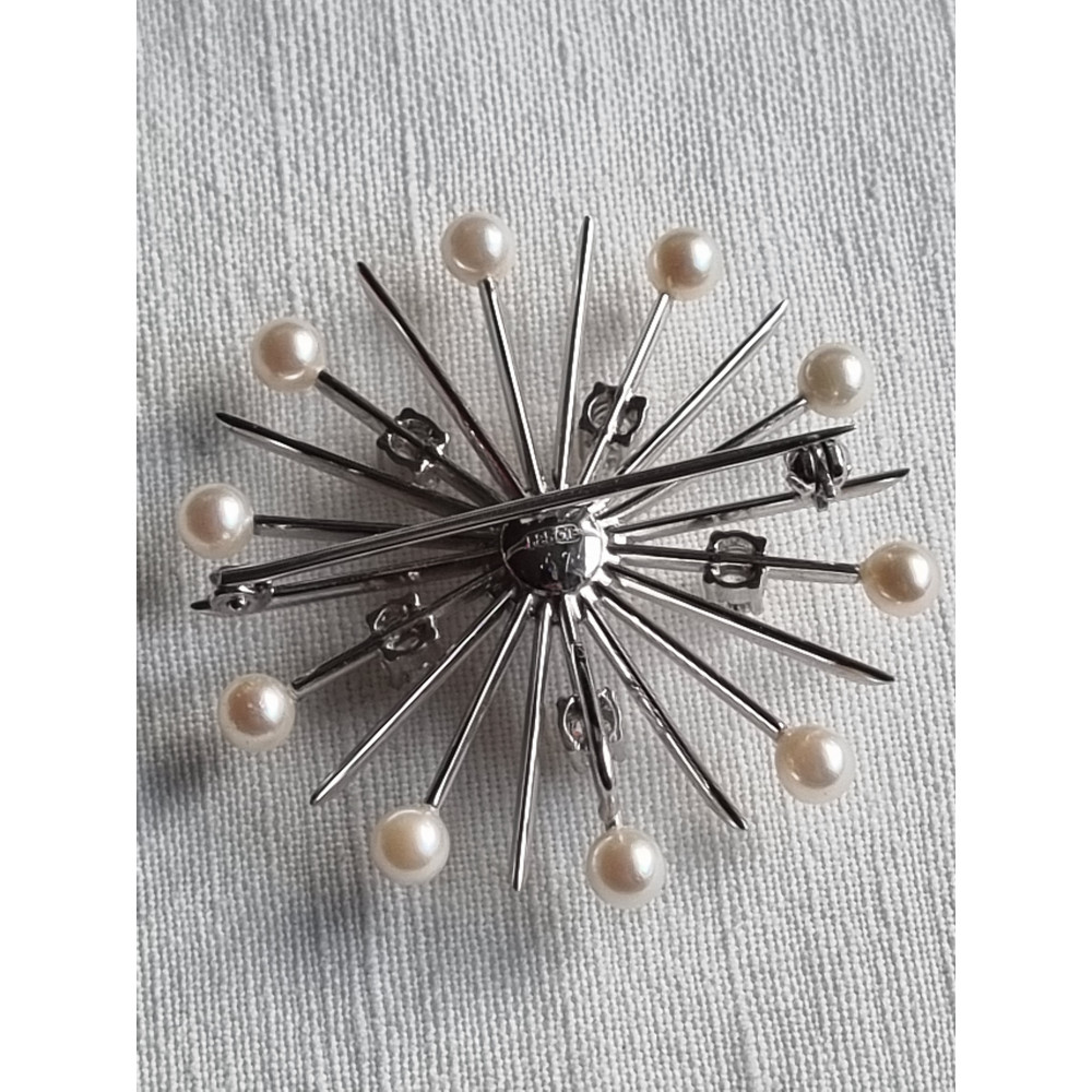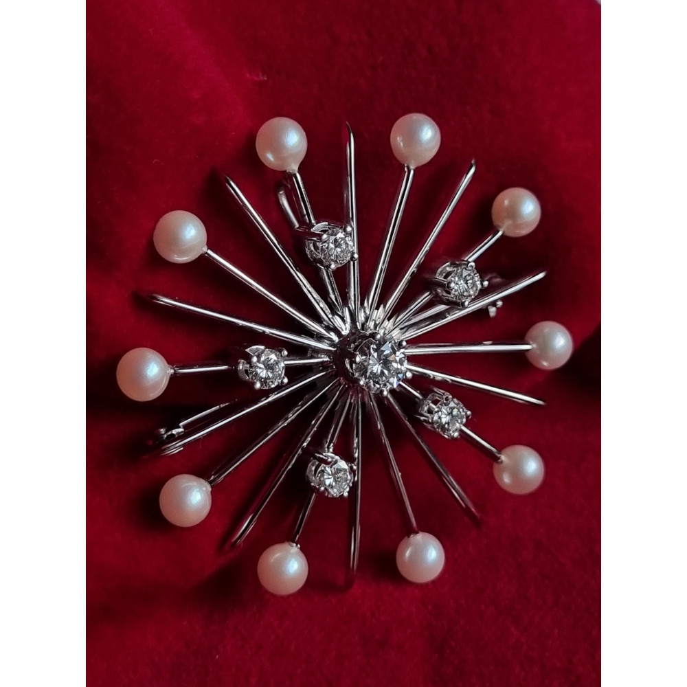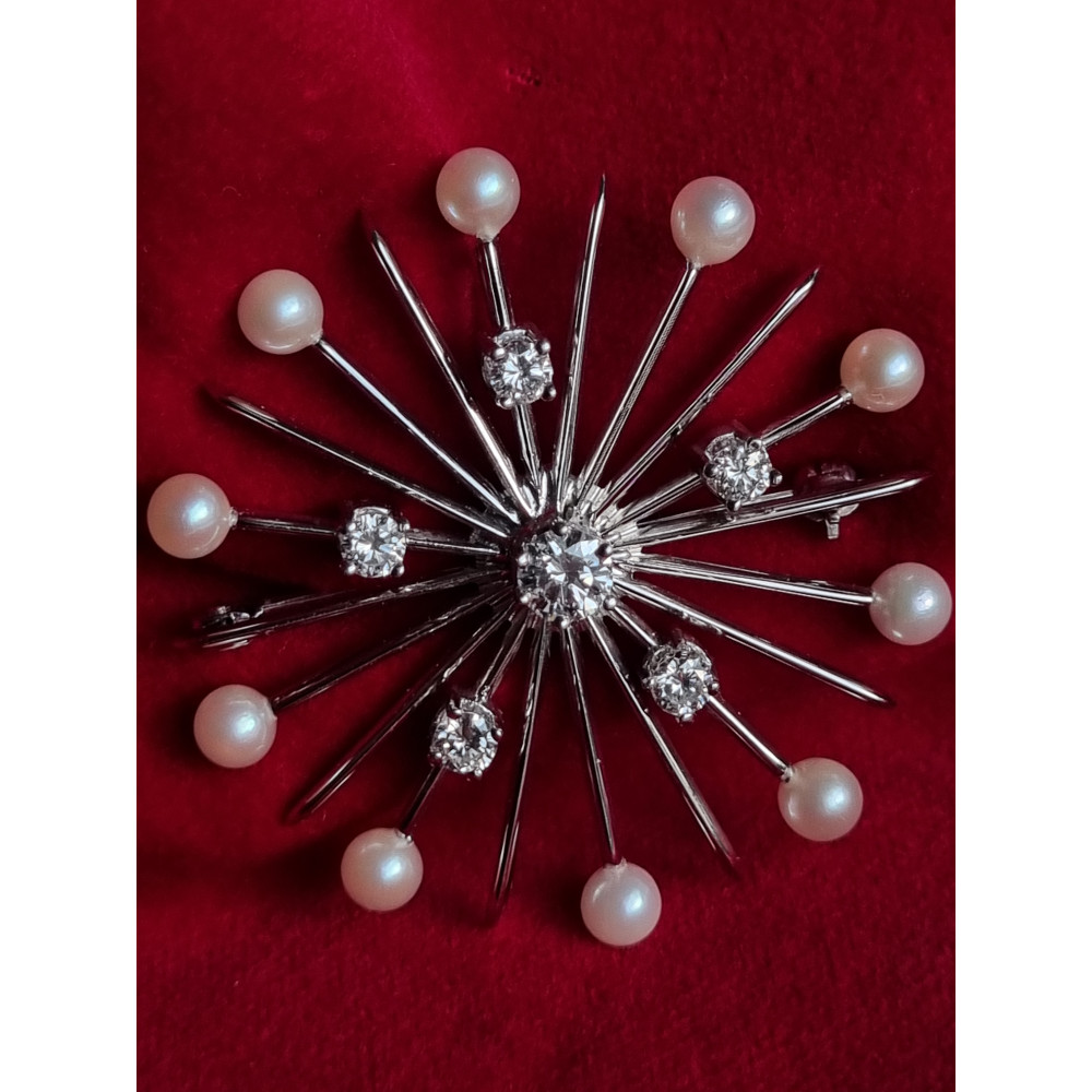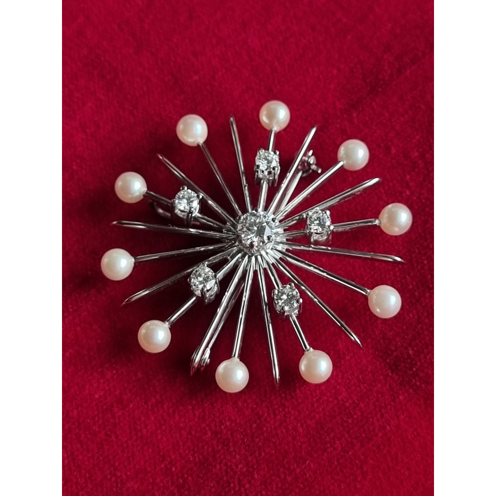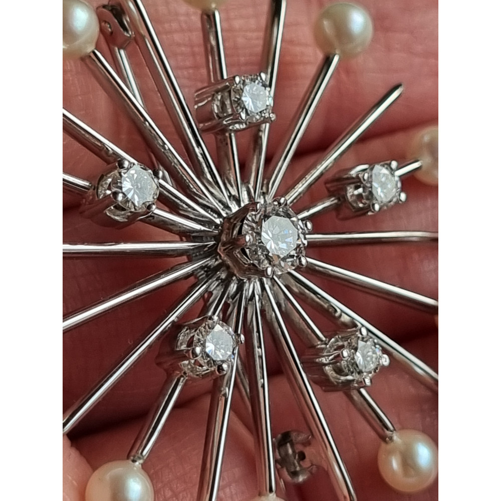 Et utsøkt eksemplar av Sonja nålen, ofte kun med perler. Denne med både diamanter og perler. Meget pene steiner. Godt stemplet på baksiden for 585, 14 karat hvitt gull og med mesterstempel fra Sigurd Homstvedt.
