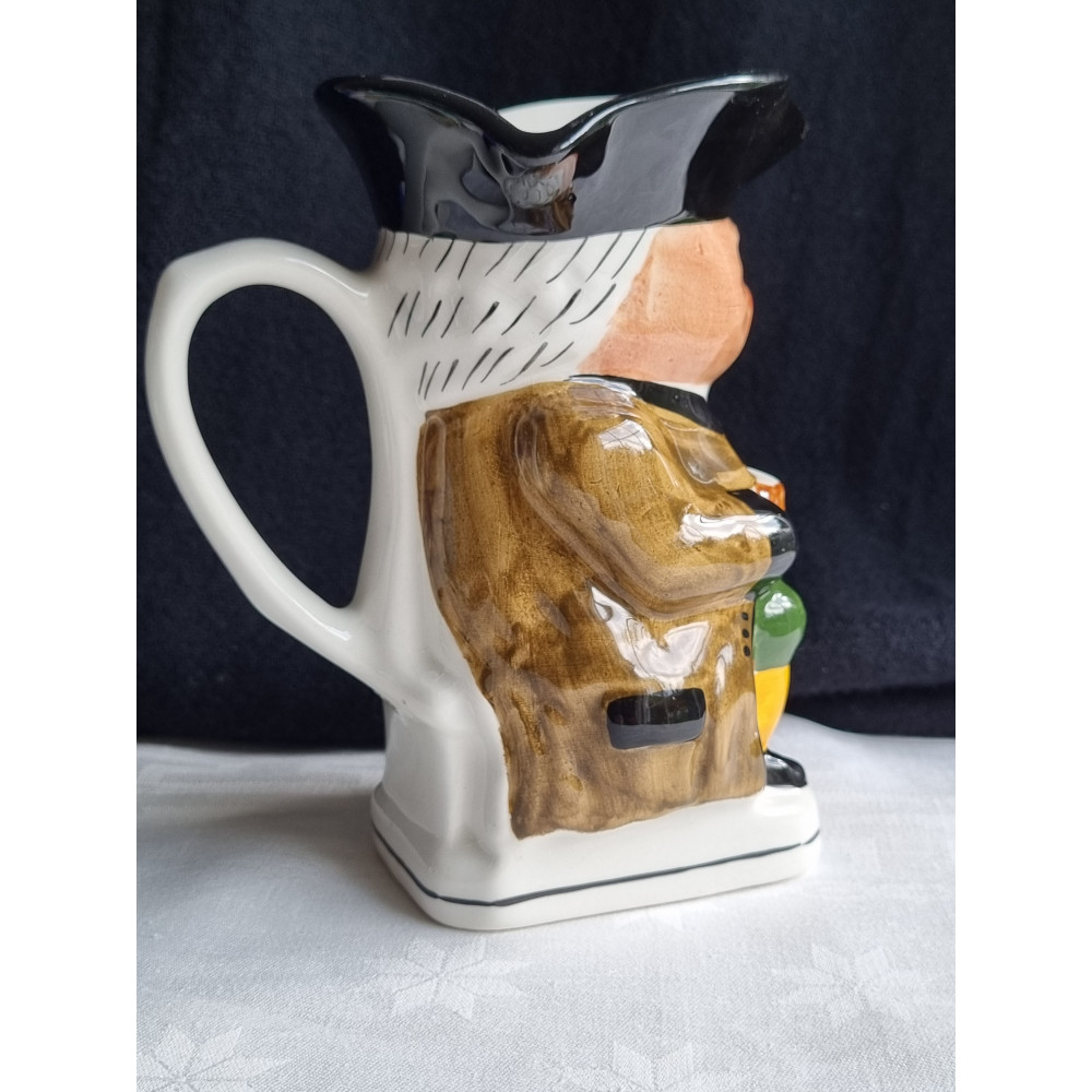 Muggen er håndmalt i flotte glasurfarger, i flott brun-beige jakke, gule sokker, grønn nikkers og sorte sko. Han holder i sin mugge med øl. Grålig hår og skjegg og en sort tricornhatt, som man kan helle ut av. Sort håndtak på baksiden. Lett krakelering på undersiden, se bilder. Rommer nesten 0,4 liter (4 dl).