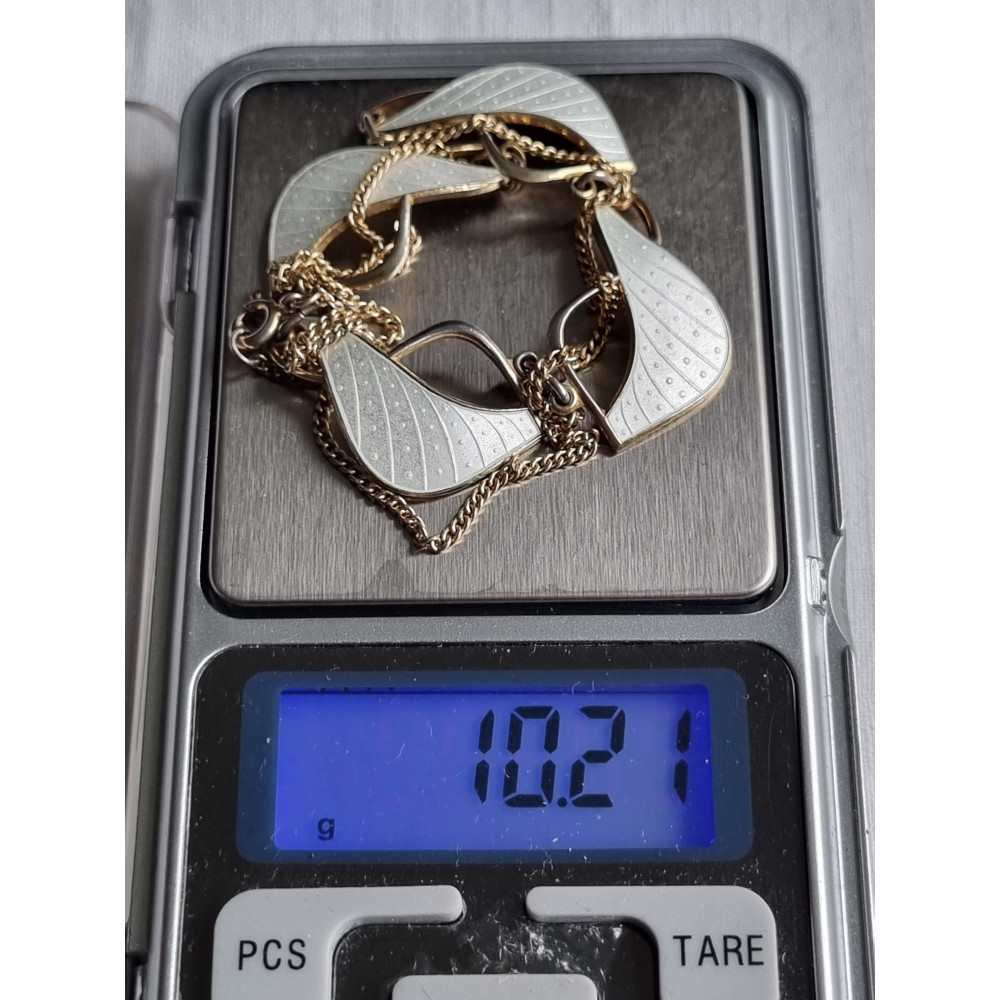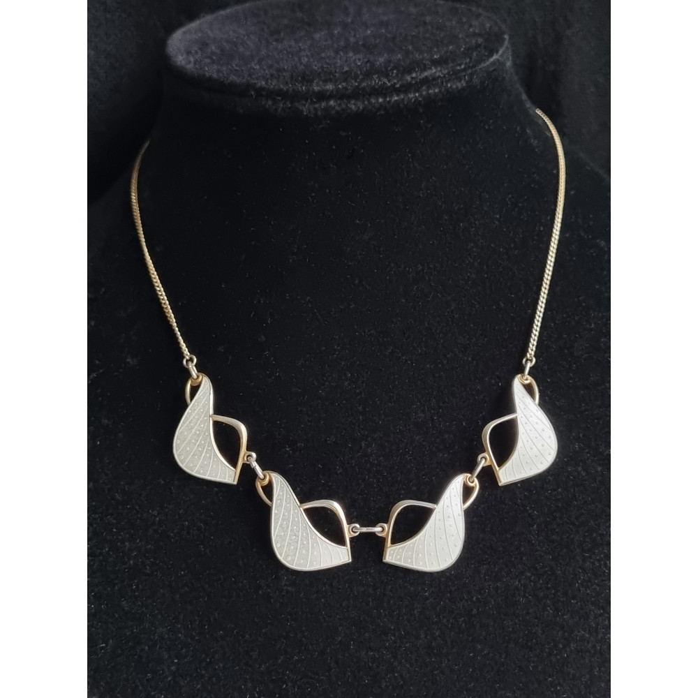 Gullforgylt sølv med hvit, vakker guilloche emalje og flott dekor. Leddet halskjede i gullforgylt sølv, med hvit vakker emalje med dekor i. Jevn og flott gullforgylling som ramme rundt hver smykke del på baksiden og kjedet. Halsgropsmykke, ligger veldig pent.