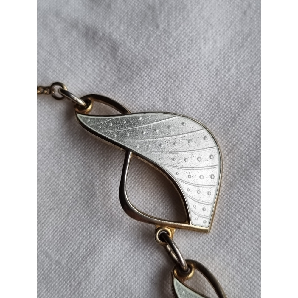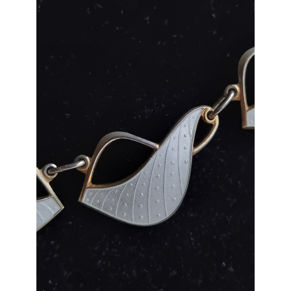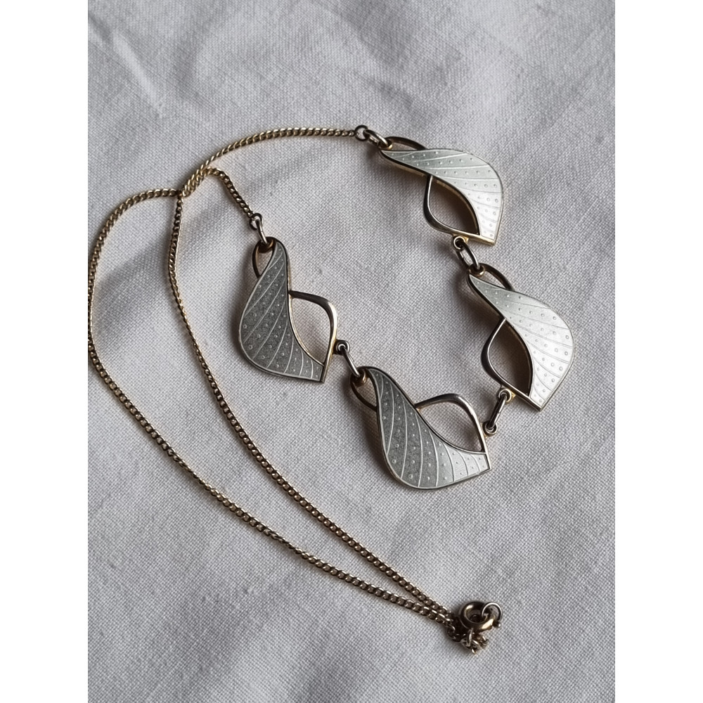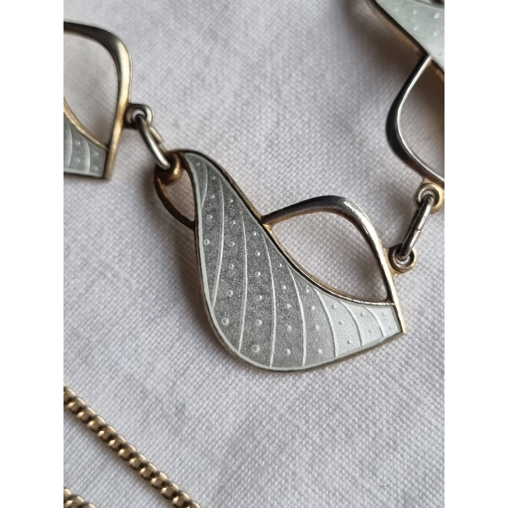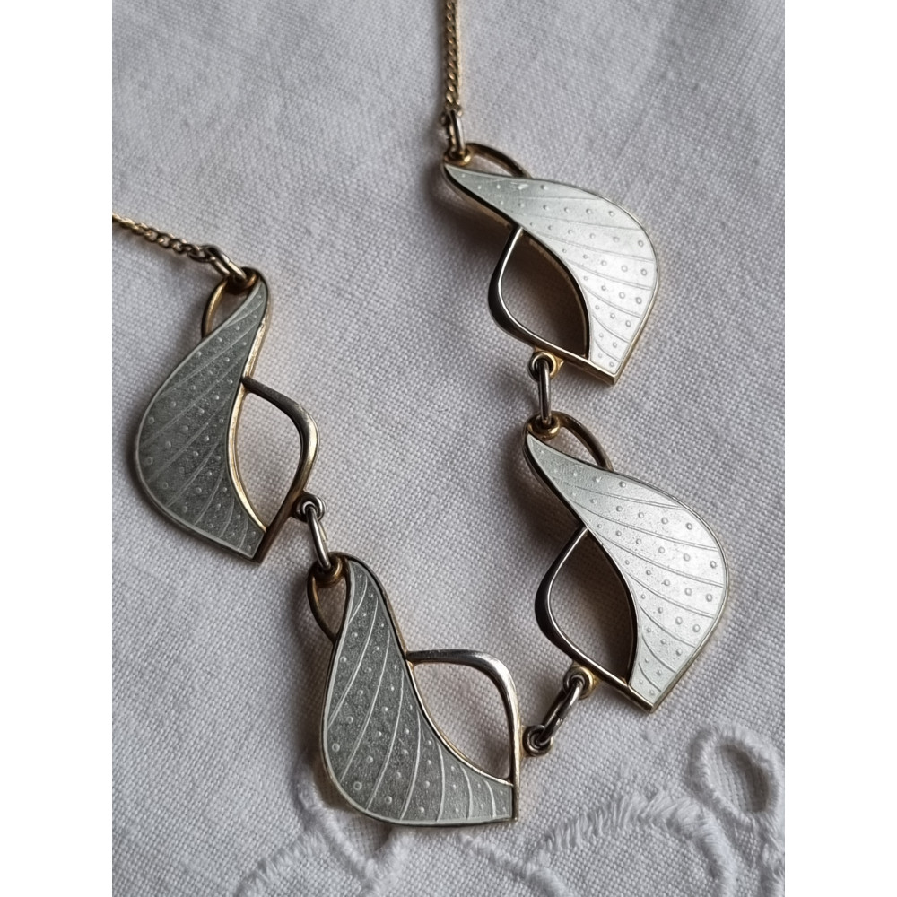 Sølv halskjede med smykke deler i sølv og hvit guilloche emalje. Det er 4 sølv emalje stykker, deler som er hektet sammen med lenker, så med kjede og lås.