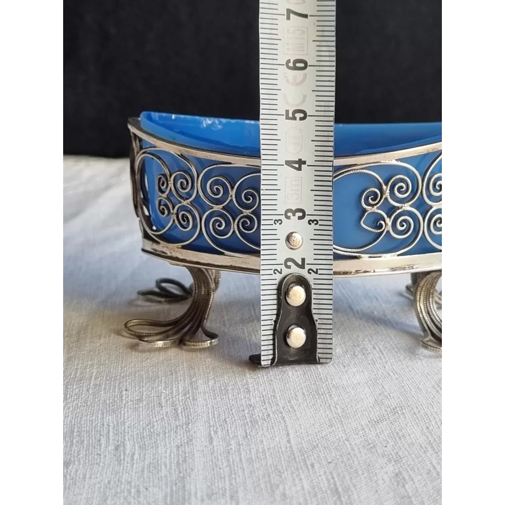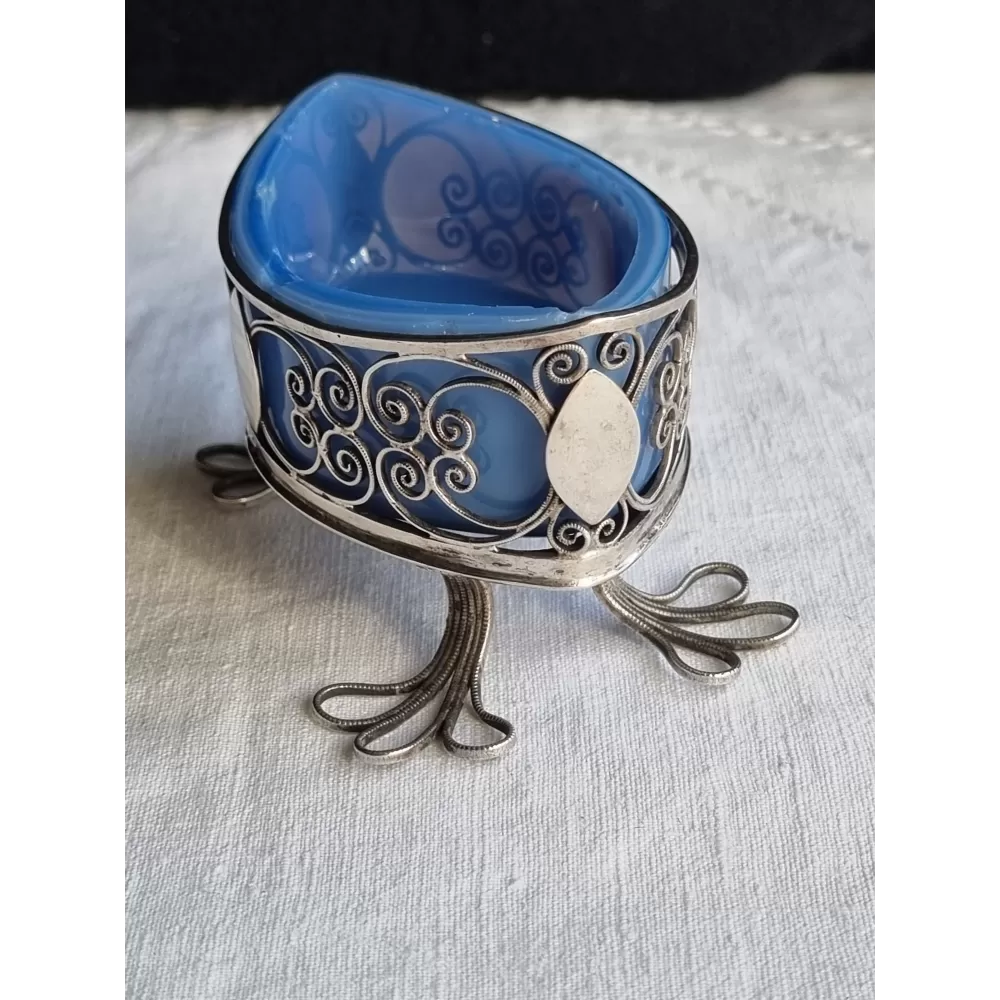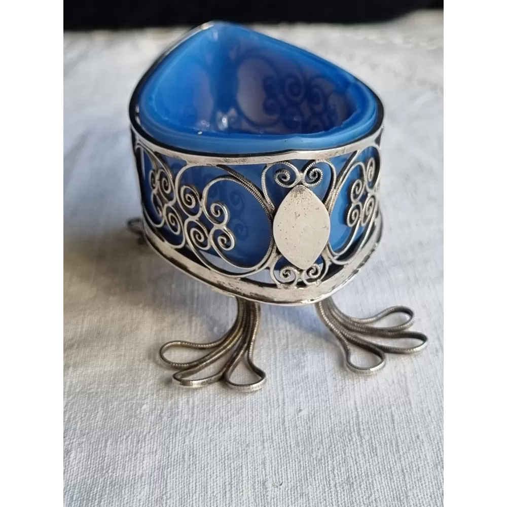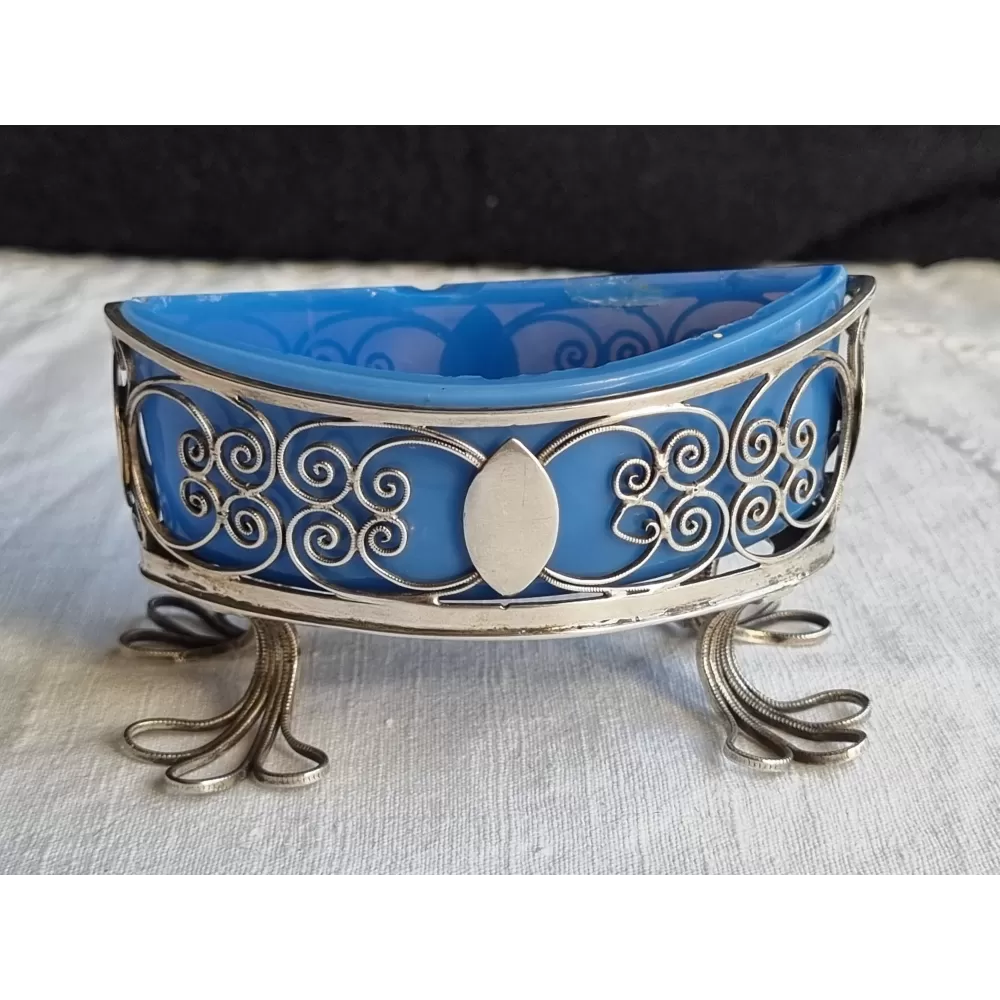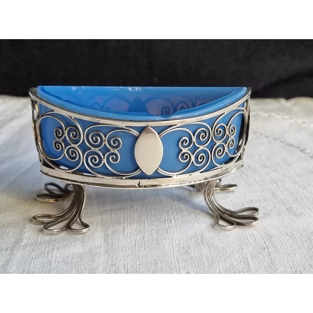 Saltkar med glassinnsats, saltkar med glass, stort saltkar-ramme i sølv. En nydelig sølv glassbeholder, med åpent arbeid av sølvrammer og inngjerdede filigran flater, til innsetting av saltglasset i solid lys blått opalin glass. Salt skål rammen i sølv.