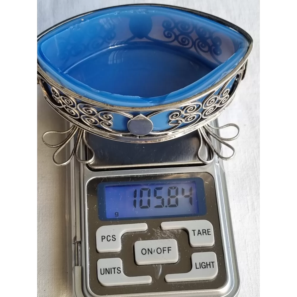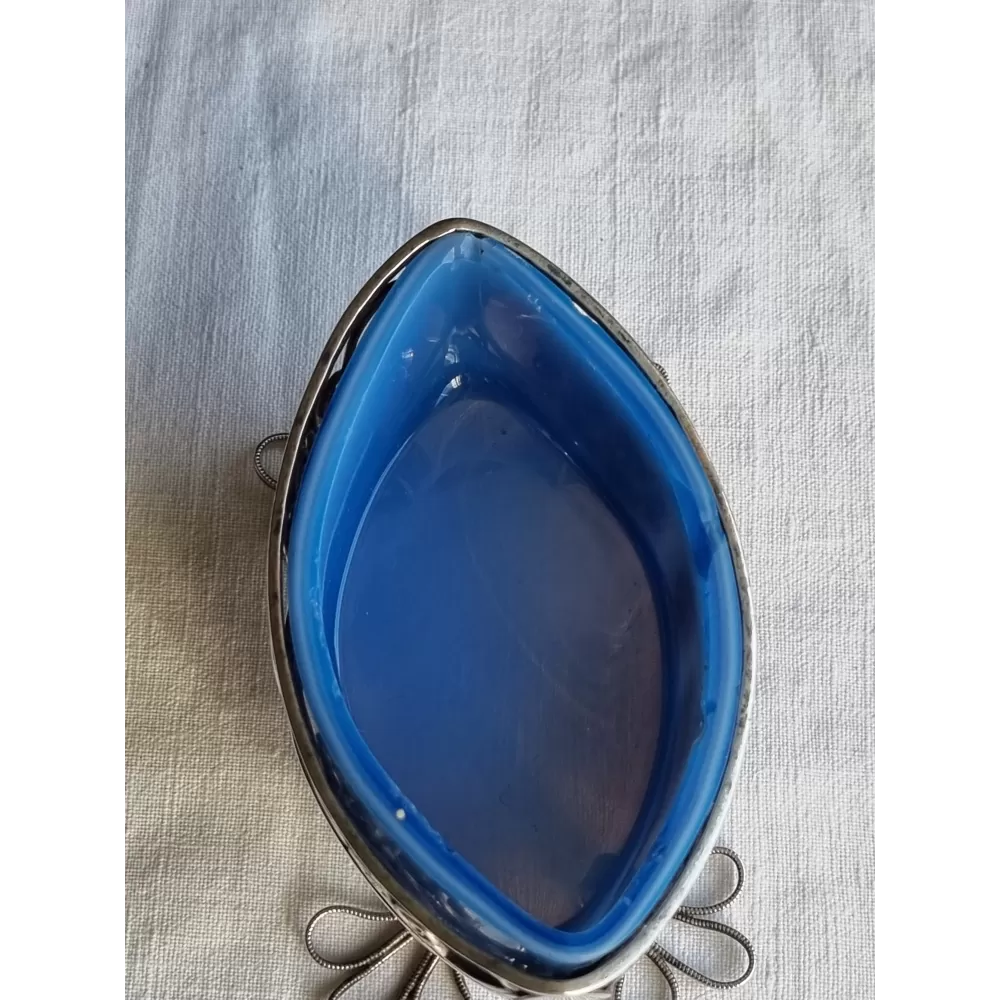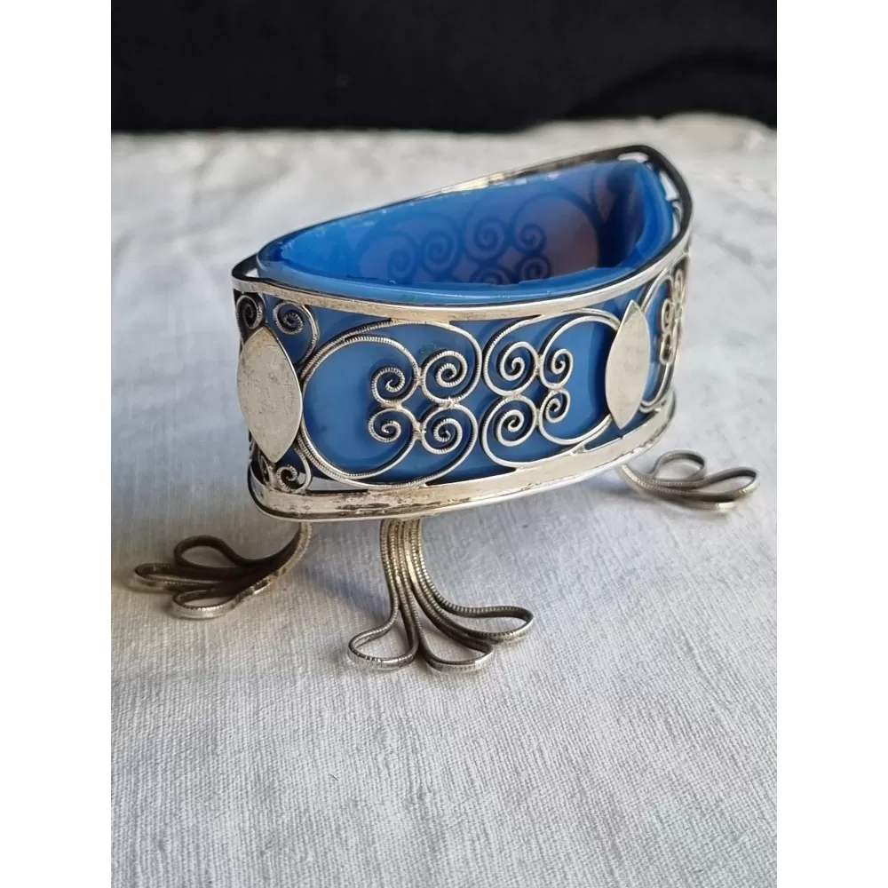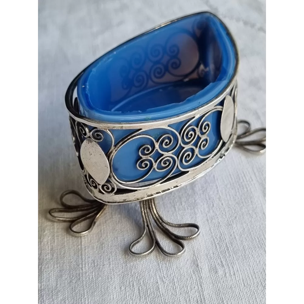 Original blått opalin glass, som passer perfekt inn i sølv formen.