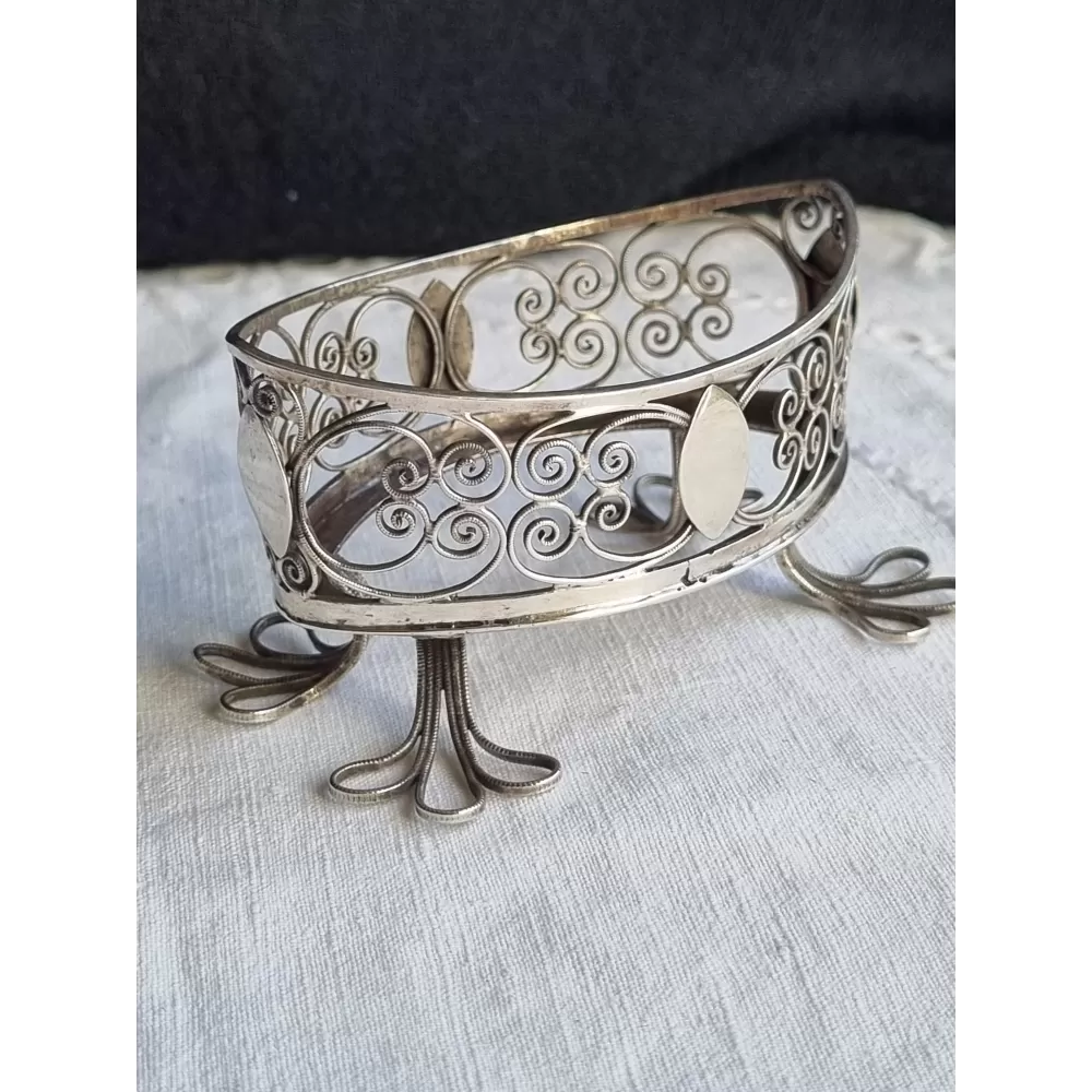 Står på fire føtter som er laget av ruglete sølvtråder, satt sammen som en kløver, tre buer for hver fot. Salt begeret står støtt på alle fire ben.