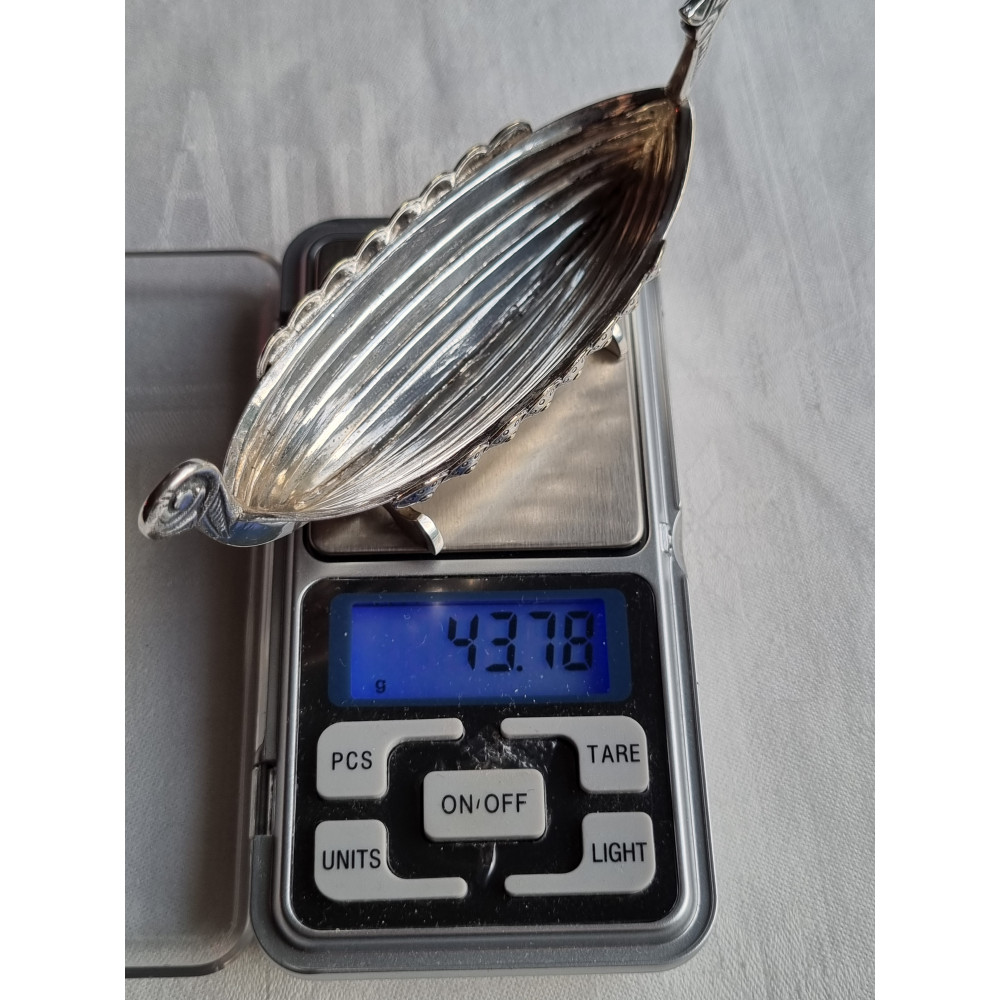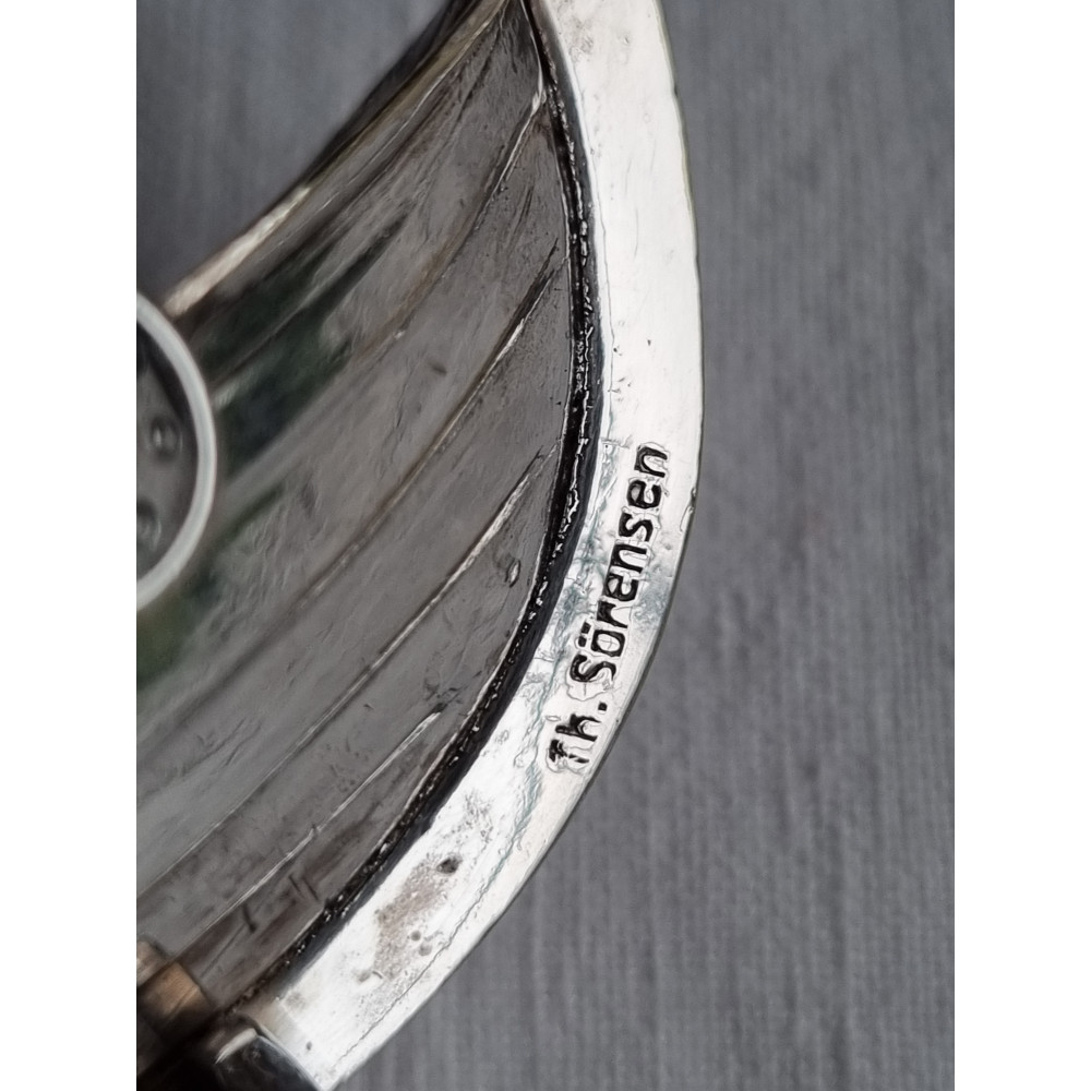 Fantastisk flott og stor saltskål, som vi har fått bekreftet er i sølv. Faktisk kun stemplet mesteren, Th. Sörensen, og det ble sagt av gullsmeden ved gjennomgang, at dette kan være et mesterstykke fra en elev. Vi kjenner ikke til noen Gullsmed Th. Sørensen, men her har vi